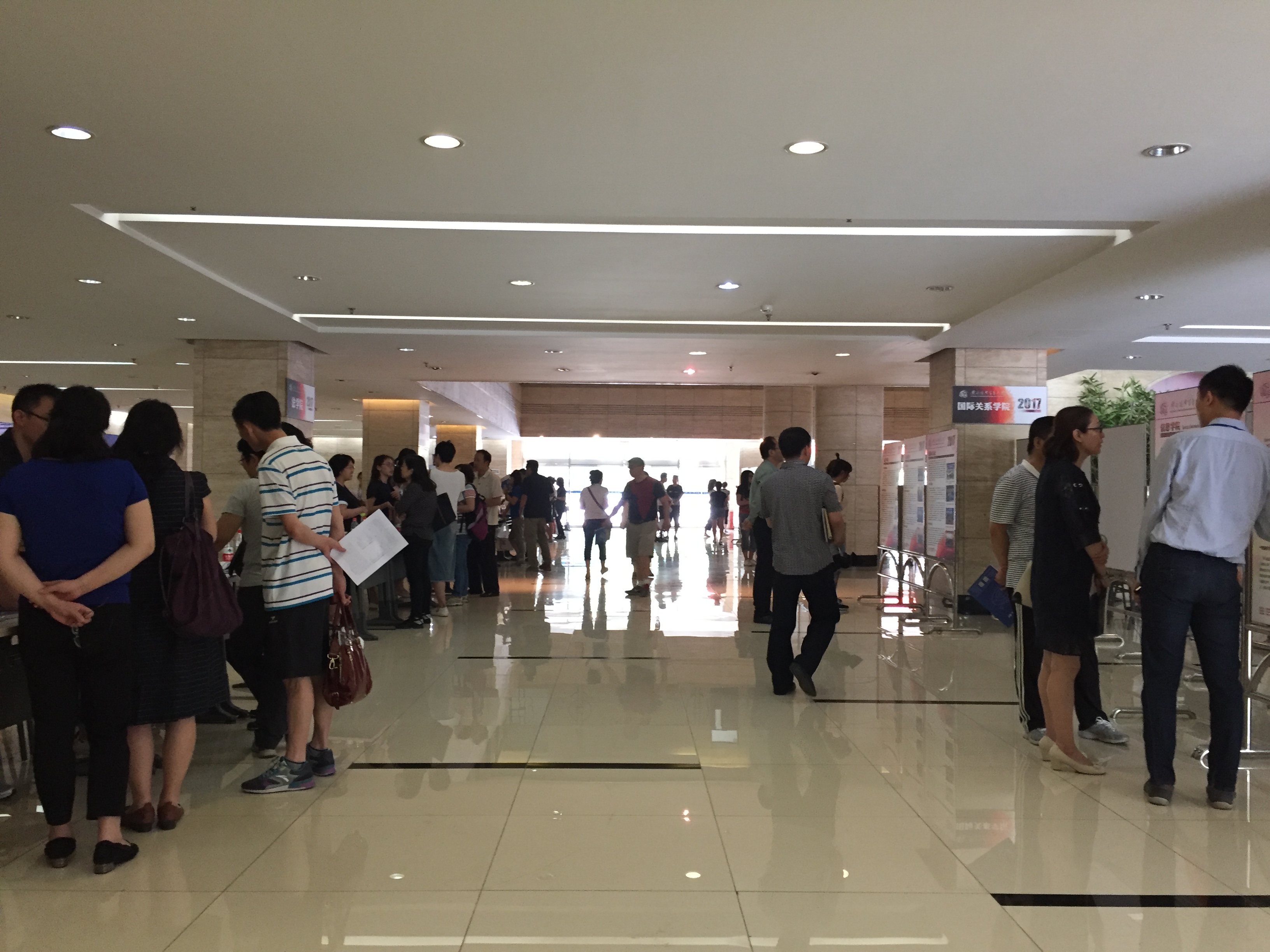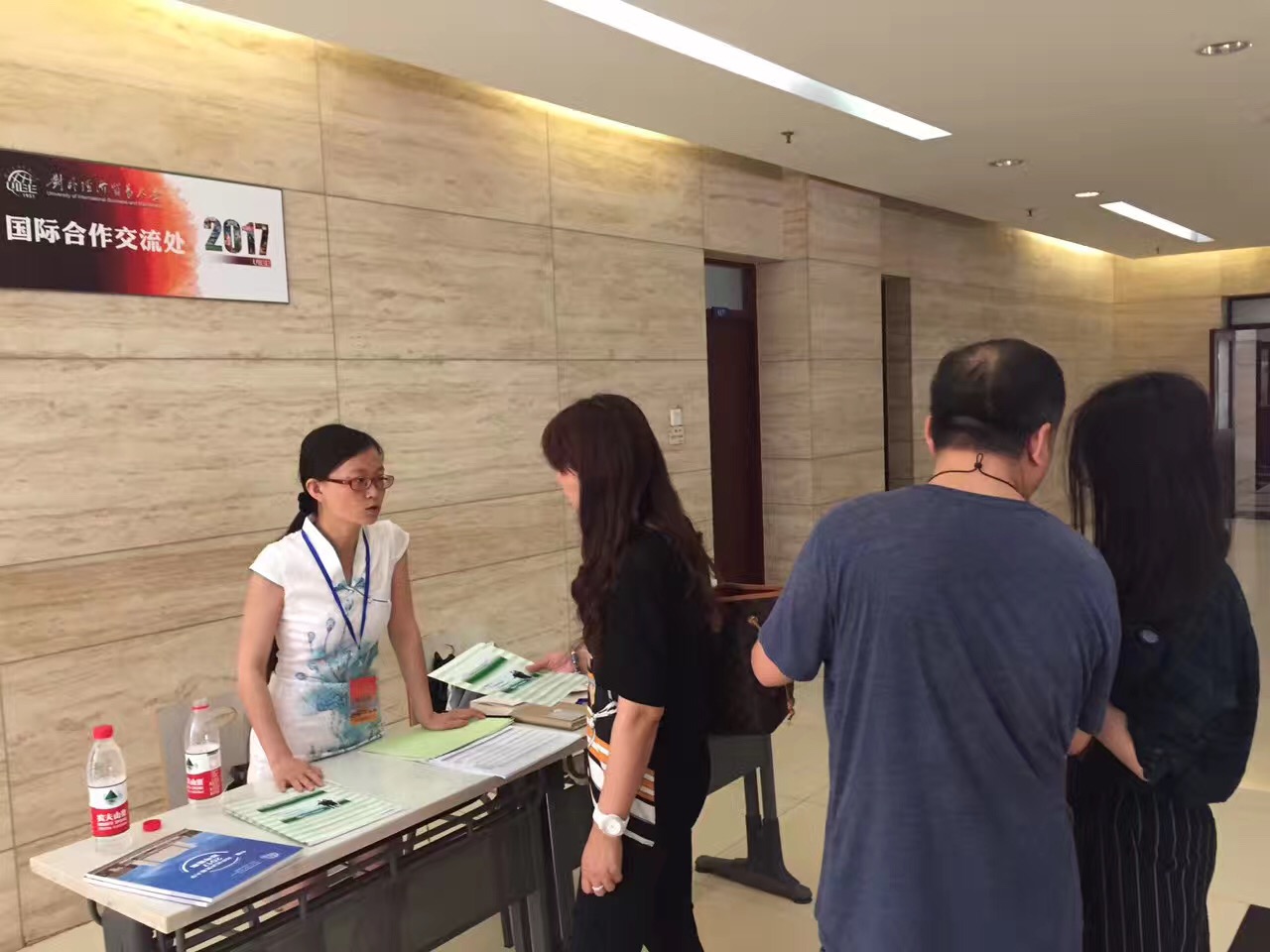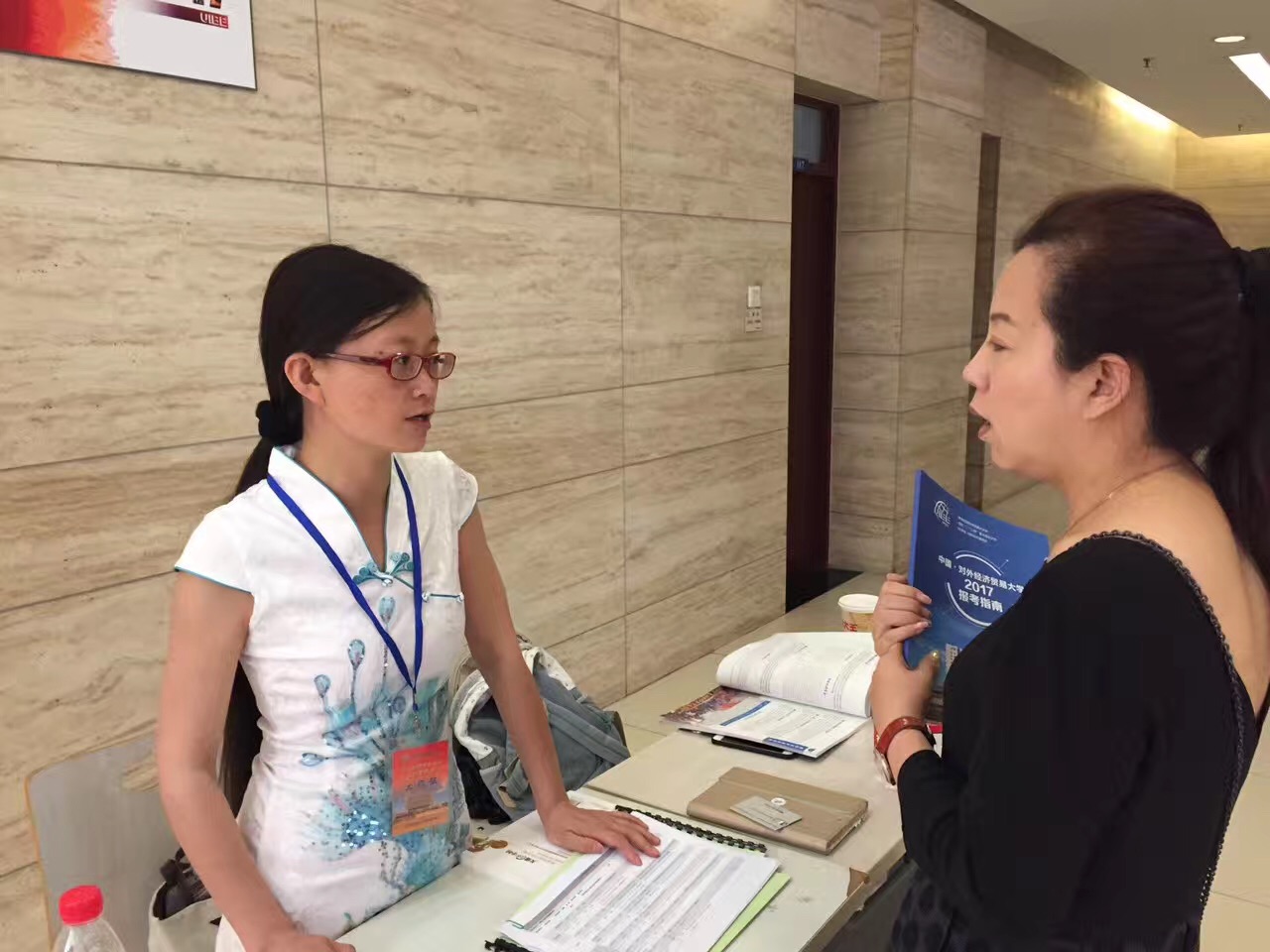 早上7:30开始,由国际合作交流处以及各本科招生学院专业咨询人员组成的咨询队伍于宁远楼一层大厅开始为考生和家长解答出国交流交换项目、学科优势、培养特色、就业去向等相关问题。国际合作交流处致力于为考生及家长解读最新海外交流项目选派政策及2017年秋季学期和2018年春季学期最新海外交流项目清单。北京一位考生家长说,她一直对对外经济贸易大学的国际化办学特色非常感兴趣,今天来到这里便是为了能了解更多关于国际合作和交流项目的信息,希望她的孩子可以顺利考入贸大进而有机会去申请海外交流交换。